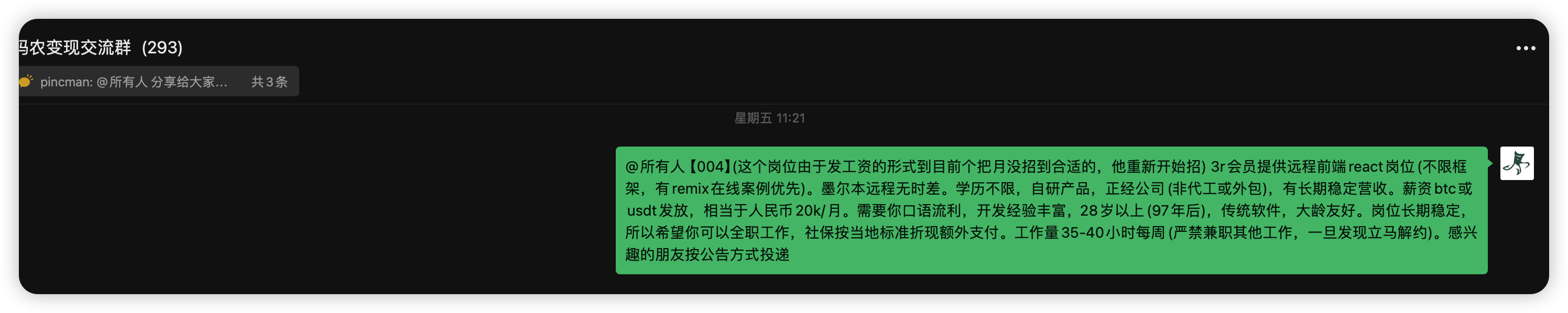 pincman 远程前端react岗位(不限框架,有remix在线案例优先)。墨尔本远程无时差。学历不限,自研产品,正经公司(非代工或外包),有长期稳定营收。薪资btc或usdt发放,相当于人民币20k/月。需要你口语流利,开发经验丰富,28岁以上(97年后),传统软件,大龄友好。岗位长期稳定,所以希望你可以全职工作,社保按当地标准折现额外支付。工作量35-40小时每周(严禁兼职其他工作,一旦发现立马解约) 感兴趣的朋友请按此规则投递