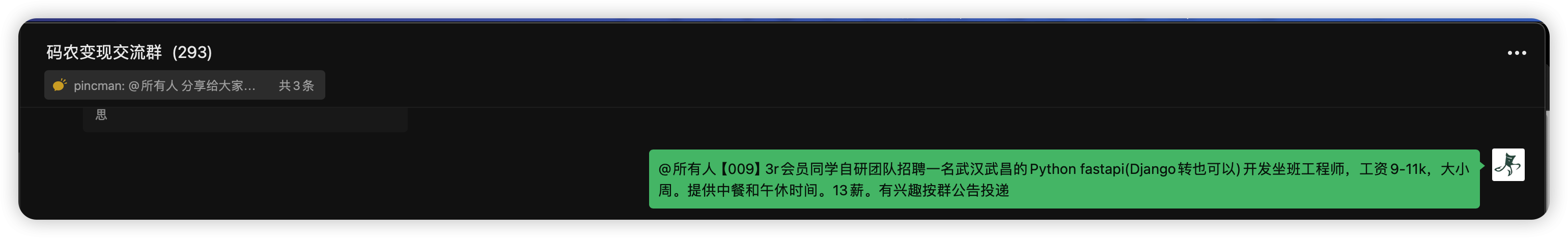 pincman 自研团队招聘一名武汉武昌的Python fastapi(Django转也可以)开发坐班工程师,工资9-11k,大小周。提供中餐和午休时间。13薪。有兴趣按群公告投递 感兴趣的朋友请按此规则投递